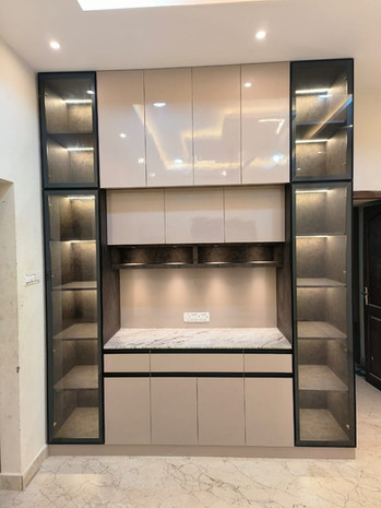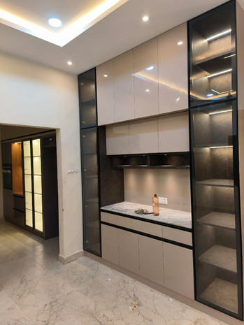 The gourmet kitchen is a chef’s paradise, featuring the latest stainless-steel appliances, custom cabinetry, and a stunning Granite cooktop that serves as both a functional workspace and an entertaining hub. Adjacent to the kitchen, the dining area is elegantly appointed, with a sleek crockery cabinet surrounded by designer glass showcase, perfect for hosting dinner parties.